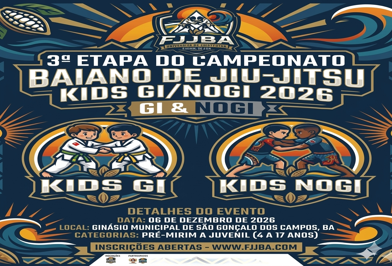 A Federação de Jiu-Jitsu da Bahia convida todos os atletas para a 3º ETAPA DO CAMPEONATO BAIANO DE JIU-JITSU KIDS! As inscrições já estão abertas! Não perca a chance de mostrar seu talento, superar desafios e se divertir com seus amigos.